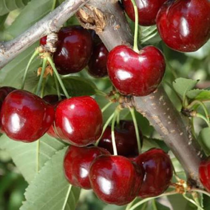 Плоды: очень крупные, широкосердцевидной формы, тёмно-красного цвета, мякоть тёмно-красная, плотная, сочная, сладкая, с винным привкусом, ароматная, косточка легко отделяется.