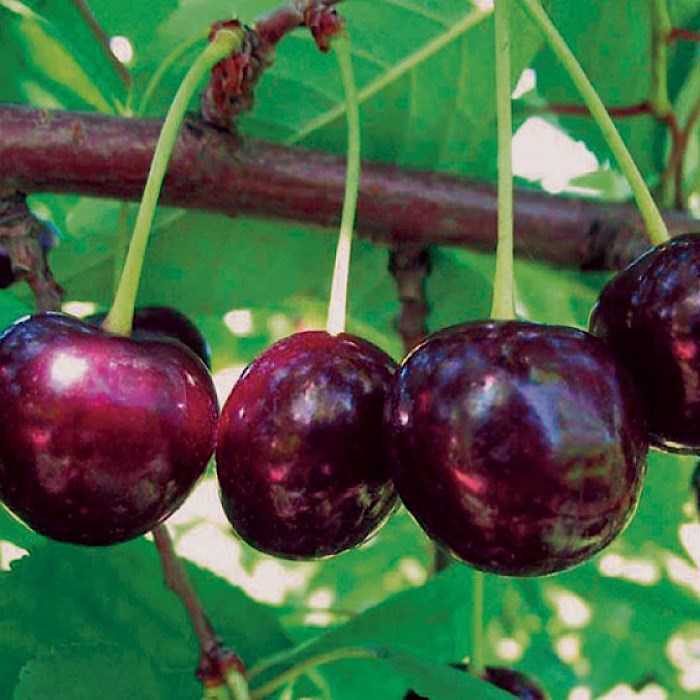 Плоды: крупные, плоскоокруглые, тёмно-красного цвета, мякоть тёмно-красная, сочная и нежная, плотная, на вкус сладкая с приятной освежающей кислинкой, косточка хорошо отделяется.