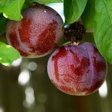 Плоды: очень крупные, округлой формы, бордово-фиолетового цвета, на вкус сладкие, сочные, напоминают смесь абрикоса и персика, ароматные, мякоть нежная, косточка легко отделяется.